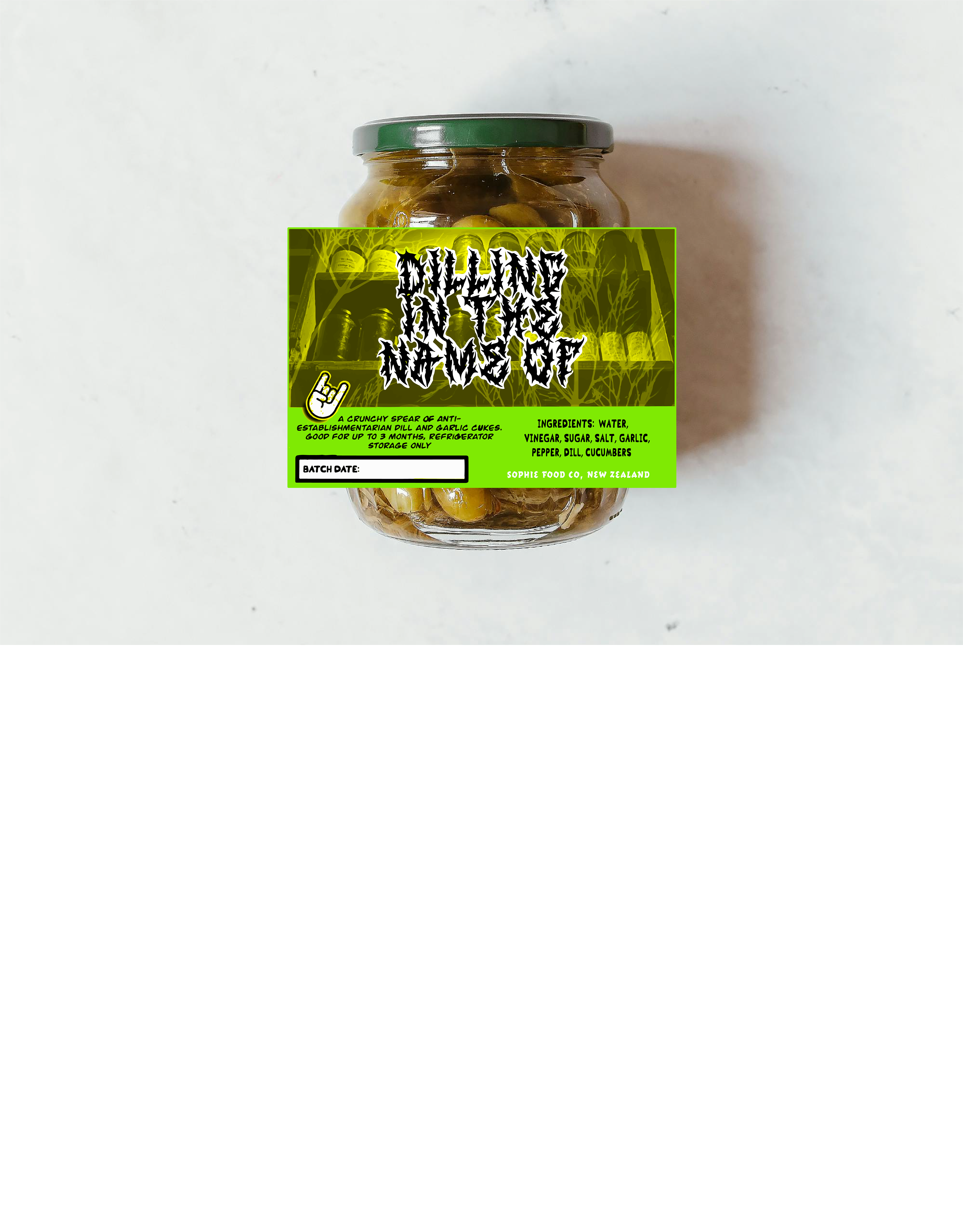 For such an endeavour i needed a label so I ASKED MY INSTAGRAM FOR A PUNNY NAME AND RECEIVED "DILLING IN THE NAME OF" PROVIDING A PUNK ROCK DESIGN BRIEF. I USED A REFERENCE IMAGE OF A WALL OF PICKLES I SAW IN BAR ONCE AS WELL AS A CYNOTYPE IMAGE OF DILL, TYING THE THE METAL FONT AESTHETIC INTO THE DESIGN. BOLD PUNCHY NEON GREEN AND CASUAL BLOTCHY TYPEFACES REMINISCENT TO LIVE MUSIC POSTERS AND FLYERS. I REALLY ENJOYED THE CREATIVITY OF PUTTING THIS TOGETHER AND ALTHOUGH THE TYPEFACE MAY NOT BE THE MOST LEGIBLE FOR PRODUCT VISIBILITY I THINK IT GRABS THE ATTENTION OF A CERTAIN PUNK PICKLE LOVIN' DEMOGRAPHIC THAT WOULD BUY THIS. I COULD also SEE A RANGE OF THESE IN OTHER BRIGHT COLOURS OR PATTERNS FOR PICKLED CARROTS, RED CABBAGE ETC.